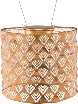 Reminiscent of "Tin Art" in a punched luminaria, and made of ultra-durable and weather resistant material, the Chevron Rays Copper Outdoor Solar Lantern is a beautiful and unique way to dress up outdoor spaces. The metallic fabric shines brilliantly during the day and a high-powered duel LED emits captivating patterns of light by night. Punched with an intricate chevron pattern, this lantern turns on at dusk to create captivating patterns of light each night. It is equipped with one AAA rechargeable battery, solar panel, dual white LED lights, and stainless-steel hardware. Designed for outdoor use. Customer assembly required.