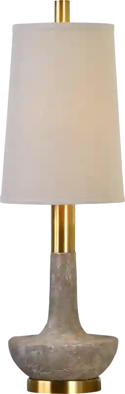 The Chipman textured stone finished table lamp is accented with plated brushed brass details and will add beauty and style to your home. The tapered round hardback shade is an oatmeal linen fabric with natural slubbing. Customer assembly required.