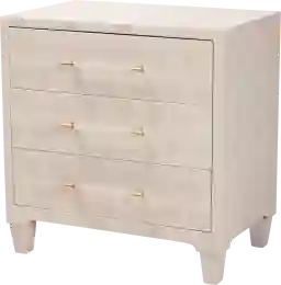 The Chipolay beige storage cabinet exudes avantgarde character while bringing versatility to any layout. This chic piece consists of a sturdy wood frame wrapped in faux shagreen for a captivating display rich with the unique granular texture of the material. Three wide drawers offer superb storage for household essentials while reserving the tabletop as an elegant display area. The Chipolay is fitted with graceful handles that brilliantly stand out against the shagreen. Tapered legs complete the graceful look, making the Chipolay a remarkable household fixture.