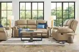 Sinking into a sanctuary of plush indulgence adds the perfect pause to the daily routine - and the classic elegance of the Churchill dual power reclining living room provides the luxury landing pad that family and friends will look forward to. Taupe top grain leather where the body touches hugs soft, traditional style curves to offer up highly inviting attached cushions. Dual power reclining seats feature adjustable headrests and footrests as well as USB-A and USB-C charging ports on each control panel. The manual reclining loveseat offers additional spots for kicking back. Top-stitched seams throughout create a tailored look, accented by gleaming nail head trim on each roll arm. Upholstery: Top grain leather where the body touches and vinyl sides and backs. Leather is a durable, low maintenance product; however, general regular maintenance is necessary. To keep your leather clean, vacuum it regularly, removing any dust, and clean it with water and a mild non-detergent soap. Accent pillows not included. Lamps not as shown in room image.