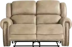 Sinking into a sanctuary of plush indulgence adds the perfect pause to the daily routine - and the classic elegance of the Churchill reclining loveseat provides the luxury landing pad that family and friends will look forward to. Taupe top grain leather where the body touches hugs soft, traditional style curves to offer up highly inviting attached cushions. Easy manual reclining in each seat offers up the perfect angle for total relaxation. Top-stitched seams throughout create a tailored look, accented by gleaming nail head trim on each roll arm. Upholstery: top grain leather where the body touches, vinyl sides and back.