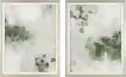 The soft, muted greens and grays of these Chyko prints interplay with the brushstrokes to suggest hazy reflections of lily pads on a still pond. Encased in a champagne silver frame with a white linen liner.
