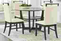 Give any dining area a contemporary spin with the Ciara collection. It features a table with a 54 inch round glass top supported by an espresso finished base. Coordinating side chairs are upholstered in neutral cream colored fabric with a leather look.