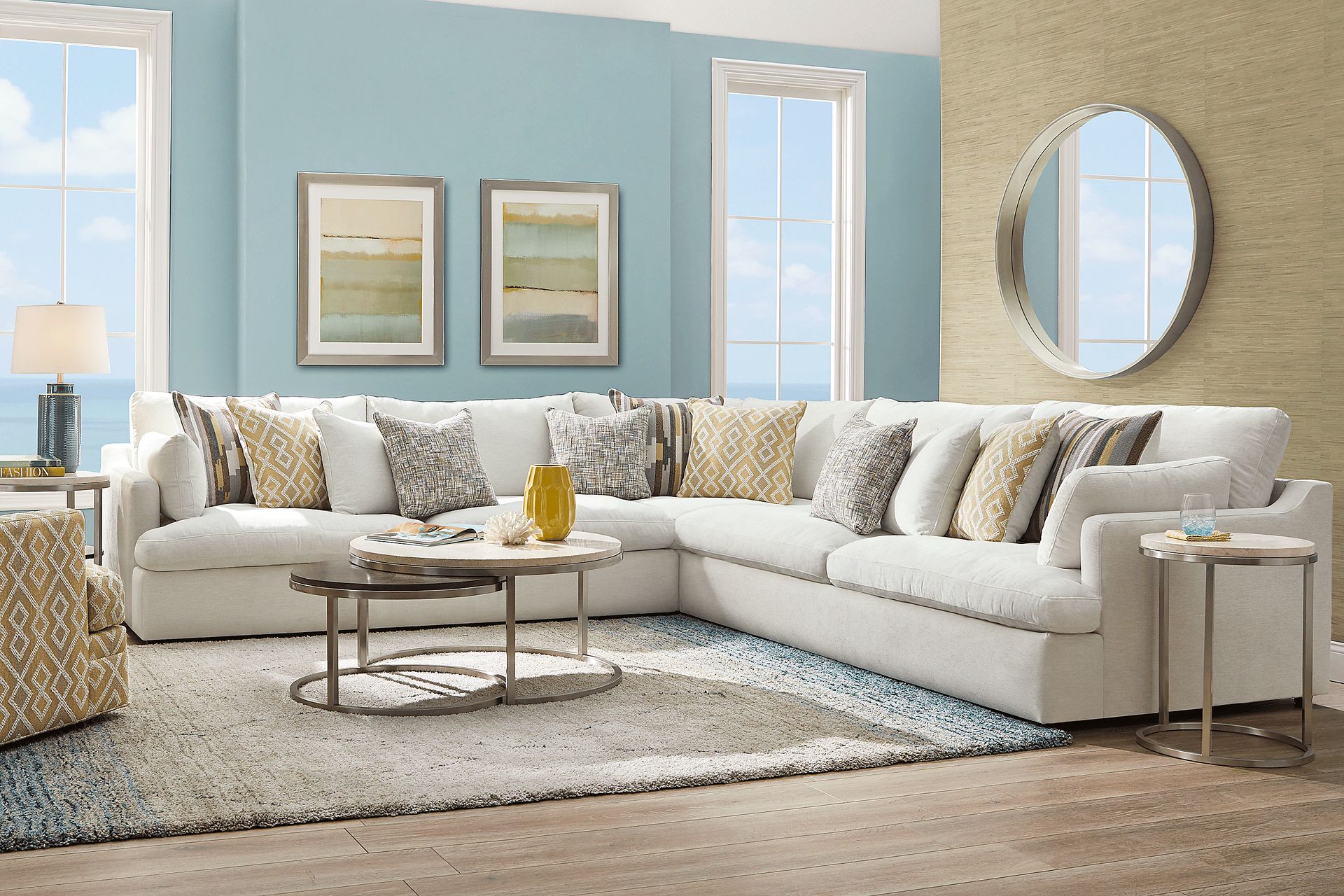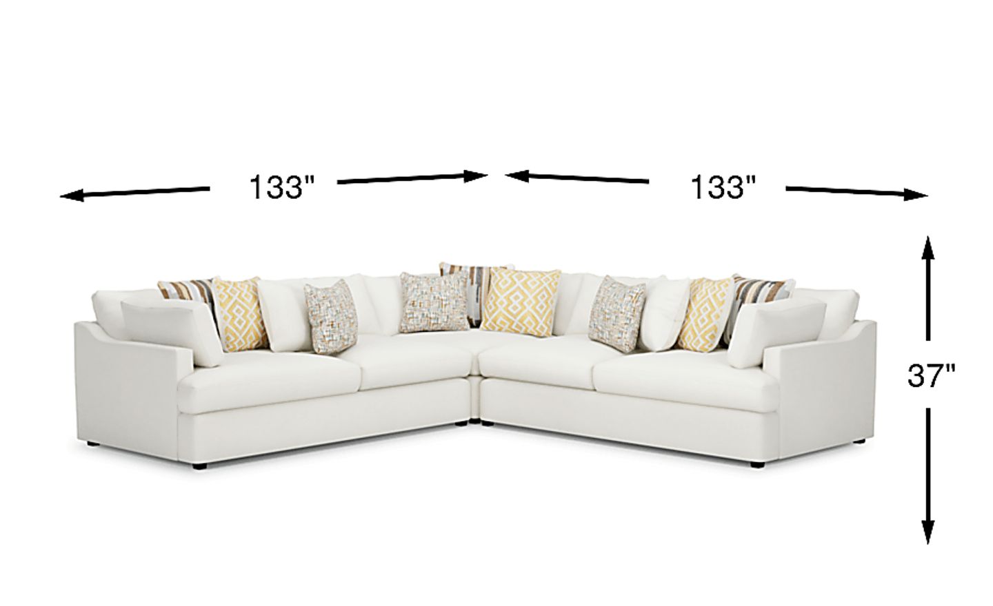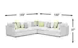 Sophisticated style comes easy with the Cindy Crawford Home Aldon Park sectional. Spacious in design, this piece offers loose FeatherBlend seat cushions and large back cushions for plush support. Sloping track arms add a modern touch as the white hue refreshes any space. Woven fabric tops this piece as patterned accent pillows add flair to the transitional design. Upholstery: 100% Polyester. Water based cleaner only.