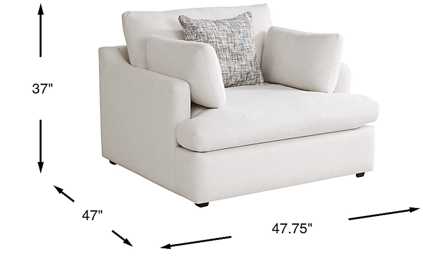 Extra wide and comfy, the Cindy Crawford Home Aldon Park chair provides surplus seating and style. Upholstered in white woven fabric, this piece features a loose FeatherBlend seat cushion and large back cushion for plush support. Sloping track arms add a modern touch and enhance the transitional design. The perfect living room companion, the Aldon Park chair completes any home. Upholstery: 100% Polyester. Water based cleaner only.