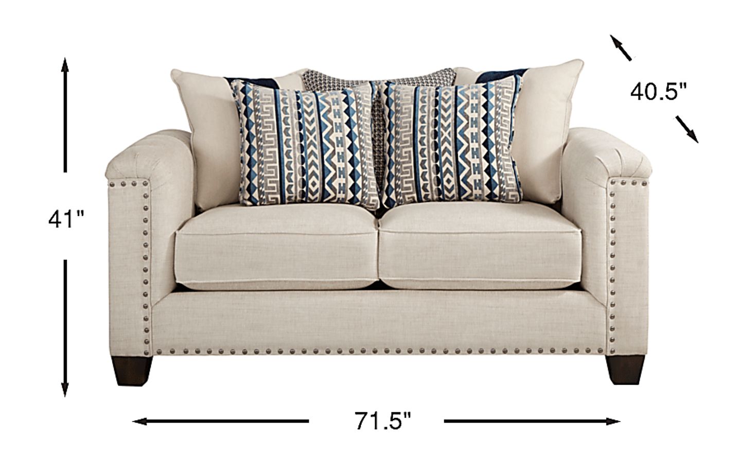 An inviting spot for two, the Asher Place loveseat adds an elegant charm to any living space. Upholstered in beige woven fabric, sleek track arms are enhanced by interior button tufting. Brushed nickel nailhead accents add an additional element of sophistication, while a stylish mix of solid and patterned back pillows makes a chic, comfortable statement. Upholstery: 72% Polyester, 28% Acrylic