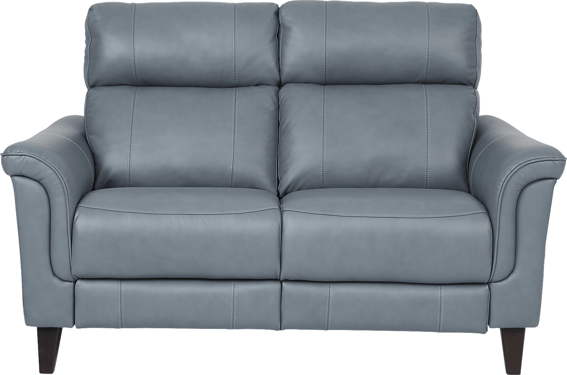 Perfect for smaller spaces or adding to your living room ensemble, the Avezzano loveseat surrounds you in comfort from head to toe. Featuring soft blue top grain leather upholstery where the body touches with coordinating baseball stitching and dual power reclining capabilities that allow you adjust the head and footrests with the touch of a button, this piece is a lesson in luxury. For additional convenience, a USB port is located on one arm of the loveseat. Shaped padded arms and angled tapered wood legs are a chic finishing touch, offering ample midcentury modern appeal. Top grain leather where the body touches and vinyl sides and backs.