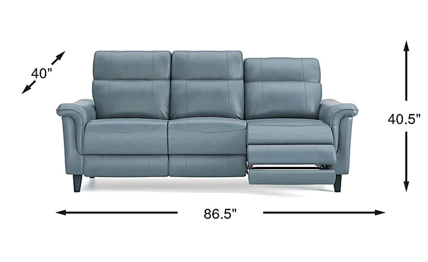 The Avezzano sofa combines luxurious amenities and style to create a sleek piece perfect for unwinding and entertaining. Outfitted with a USB port and dual power headrests and footrests that can be raised and lowered with the touch of a button and upholstered in rich blue top grain leather where the body touches with coordinating baseball stitching, this piece also features shaped padded arms for a clean, contemporary look. Angled tapered wood legs deliver an elevated profile, embodying midcentury modern appeal. Top grain leather where the body touches and vinyl sides and backs.