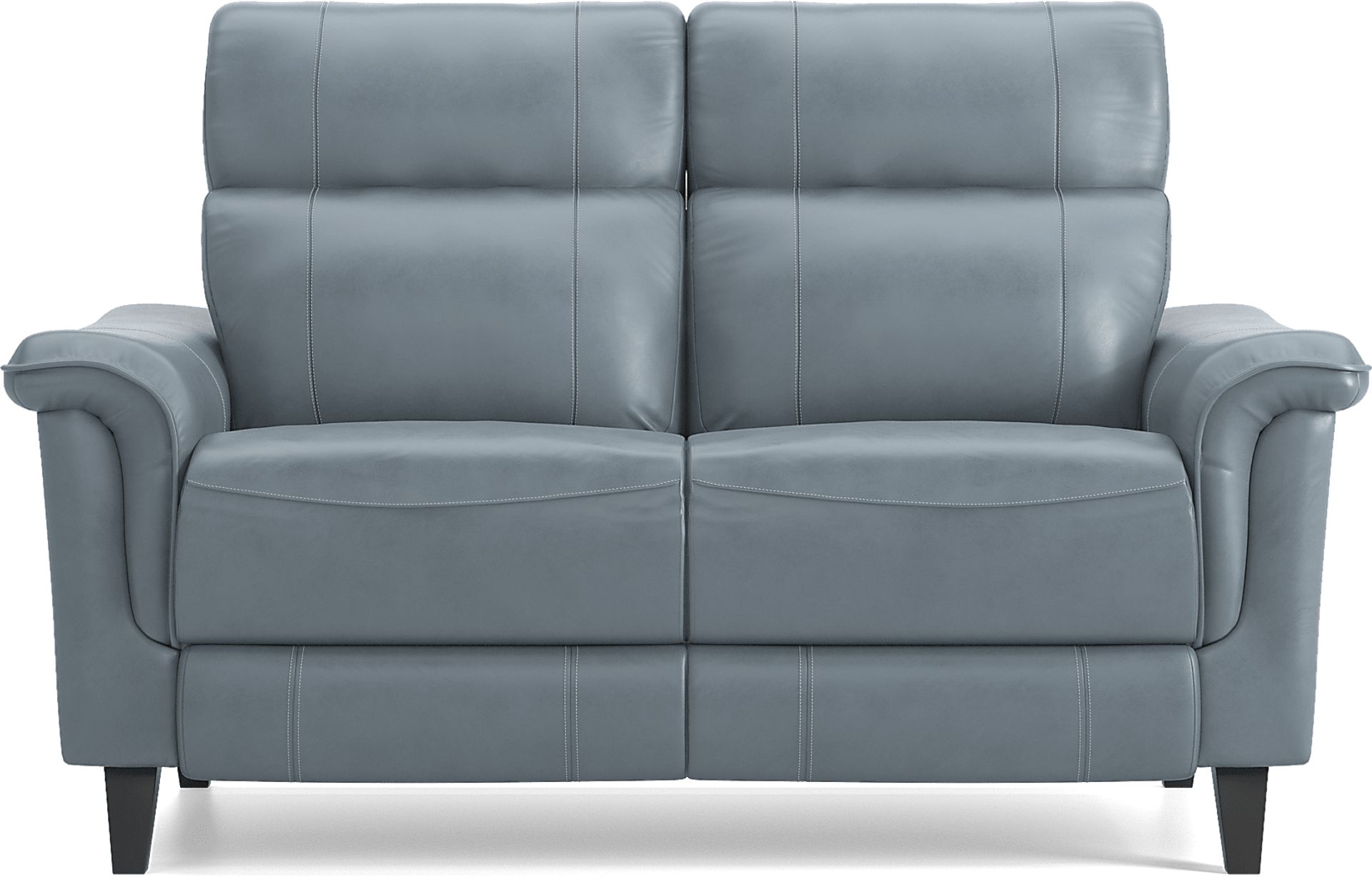 Perfect for smaller spaces or adding to your living room ensemble, the Avezzano loveseat surrounds you in comfort from head to toe. Featuring soft blue top grain leather upholstery where the body touches with coordinating baseball stitching, this piece is a lesson in luxury. Shaped padded arms and angled tapered wood legs are a chic finishing touch, offering ample midcentury modern appeal. Top grain leather where the body touches and vinyl sides and backs.