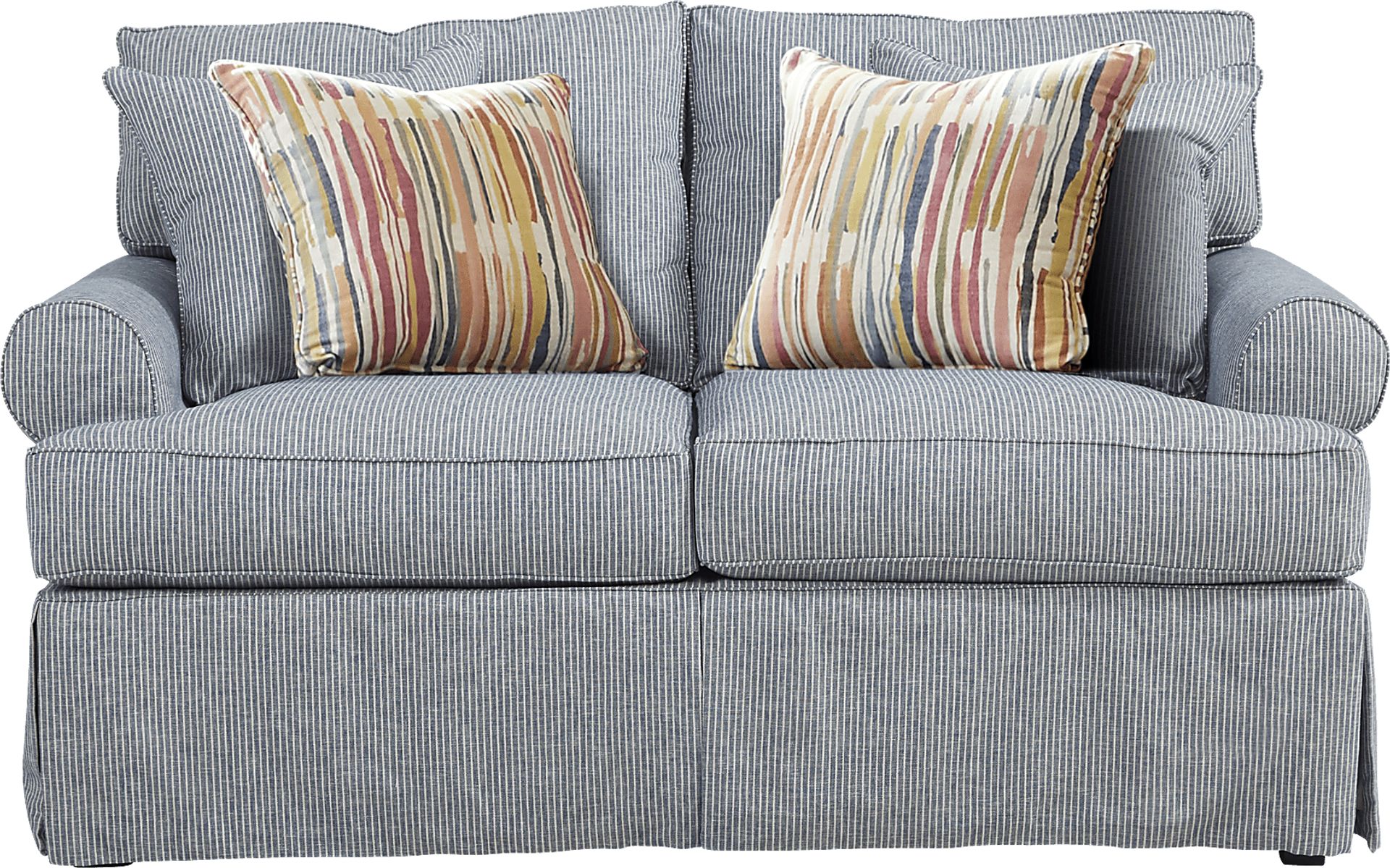 For casual cozy seating, nothing beats the Beachside denim loveseat. The blue denim slipcover is striped for an easy and relaxed look. Reversible cushions extend the life of the loveseat. Contemporary accent pillows as well as matching blue denim toss pillows are included. Upholstery: 100% Cotton.