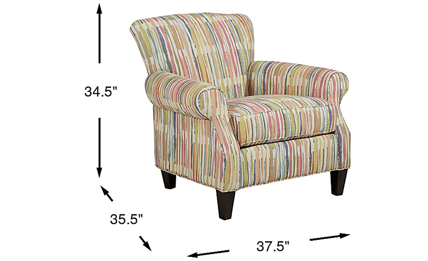 Like an umbrella on the beach, the Beachside Walk accent chair adds a splash of color to the room. Quality manufacturing, and traditional design elements including rolled arms and tapered legs, ensure years of delight. A thick seat cushion and upholstery with abstract watercolor-style stripes of blue, beige, green, red and cream colors, provides lasting seating comfort. Upholstery: 50% Polyester, 24% Cotton, 12% Rayon, 14% Linen