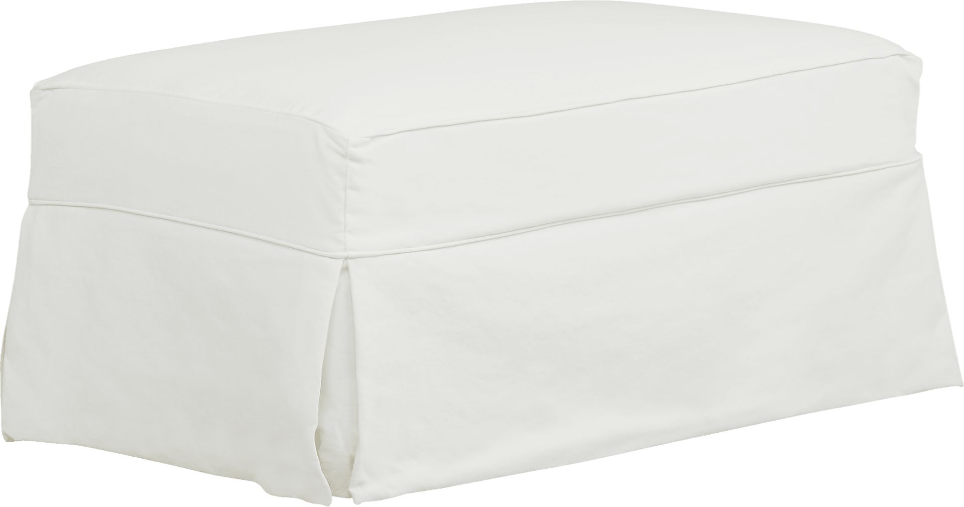 The skirted bottom on this ottoman provides a polished, traditional look that conceals the legs and creates a soft, grounded silhouette. This design element is a hallmark of casual, slipcovered styling, helping to soften the lines of a room and hide any dust that might collect underneath. It enhances the "Beachside Walk" collection's inviting and cozy feel.