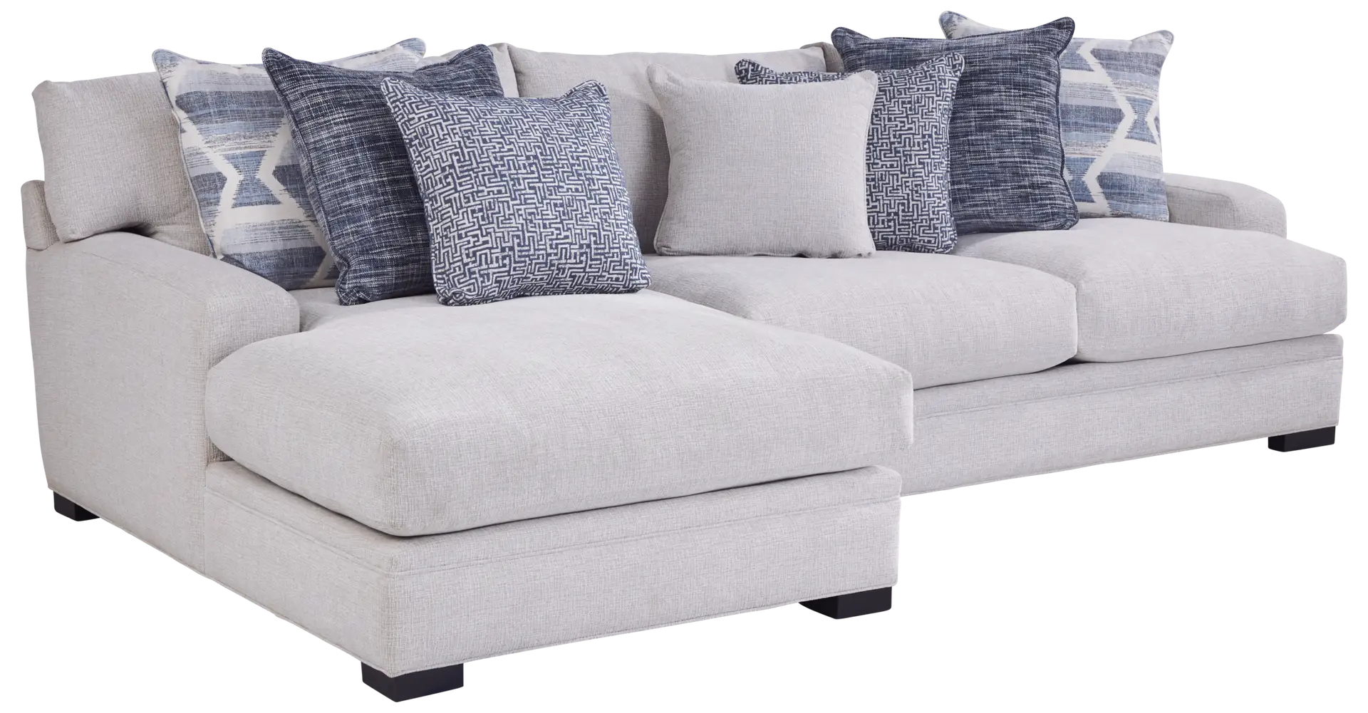 Create a comfortable, inviting gathering area with the Bedford Park sectional from Cindy Crawford Home. Upholstered with woven fabric in ivory, this chaise sectional has a soft, textured quality that will make family and friends feel right at home. Seat cushions feature a plush custom blend of feathers, fiber and down surrounding a supportive foam core for comfort that's soft yet structured. Offering a hint of modern style, its low-profile track arms bring a chic aspect to the look. In addition, seat and back cushions are reversible to help extend the life of your sectional. An assortment of accent pillows features beautiful patterns in varying shades of blue as well as solid ivory. Block legs with a black finish add an elegant final touch. Upholstery: 100% Polyester