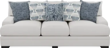 Because of its grand scale, this sectional is best anchored by an oversized area rug. Ideally, a 10x14 or 12x15 rug should be used so that all front legs—and the entire chaise—sit comfortably on the rug. This prevents the "floating rug" look and creates a more grounded, professional interior design aesthetic. The ivory upholstery provides a neutral canvas that pairs beautifully with the included blue-patterned accent pillows or a variety of textured rugs.