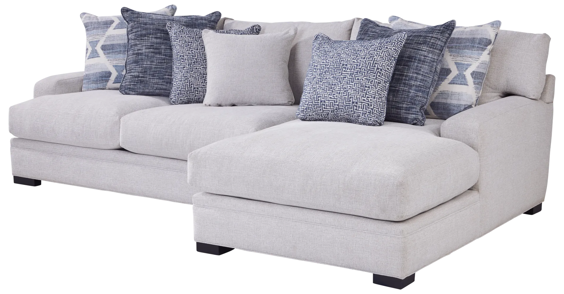 Because of its grand scale, this sectional is best anchored by an oversized area rug. Ideally, a 10x14 or 12x15 rug should be used so that all front legs—and the entire chaise—sit comfortably on the rug. This prevents the "floating rug" look and creates a more grounded, professional interior design aesthetic. The ivory upholstery provides a neutral canvas that pairs beautifully with the included blue-patterned accent pillows or a variety of textured rugs.