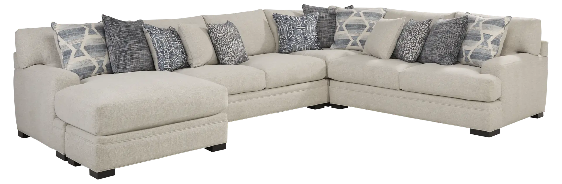 Create a comfortable, inviting gathering area with the Bedford Park sectional from Cindy Crawford Home. Upholstered with woven fabric in ivory, this chaise sectional has a soft, textured quality that will make family and friends feel right at home. Seat cushions feature a plush custom blend of feathers, fiber and down surrounding a supportive foam core for comfort that's soft yet structured. Offering a hint of modern style, its low-profile track arms bring a chic aspect to the look. In addition, seat and back cushions are reversible to help extend the life of your sectional. An assortment of accent pillows features beautiful patterns in varying shades of blue as well as solid ivory. Block legs with a black finish add an elegant final touch. Upholstery: 100% Polyester