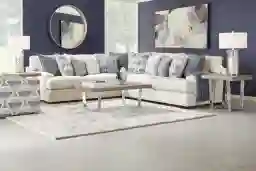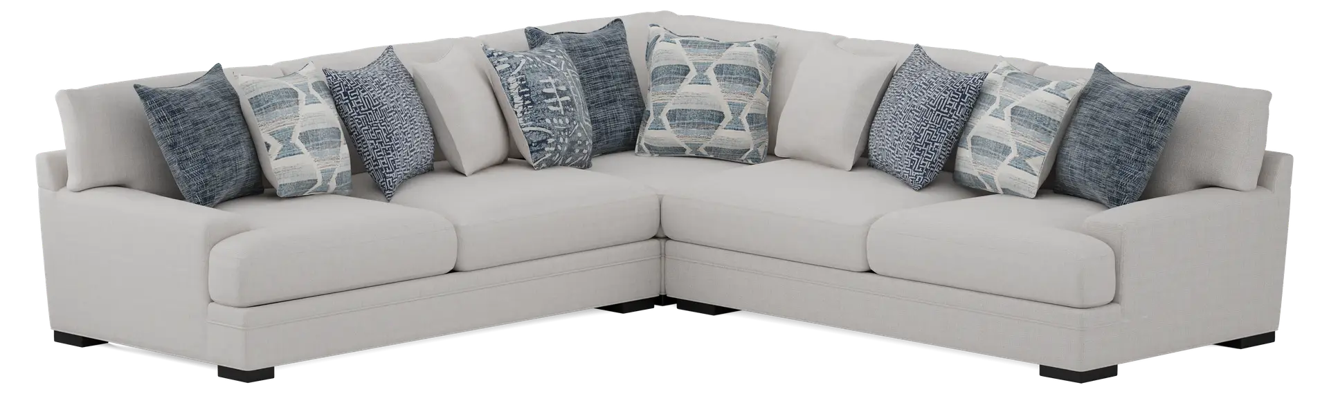Boasting noteworthy style with comfort to match, the Bedford Park sectional from Cindy Crawford Home creates a cozy gathering area for all to enjoy. Upholstered with woven fabric in ivory, this sectional has a soft, textured quality that will make family and friends feel right at home. Seat cushions feature a plush custom blend of feathers, fiber and down surrounding a supportive foam core for comfort that's soft yet structured. Offering a hint of modern style, its low-profile track arms bring a chic aspect to the look. In addition, seat and back cushions are reversible to help extend the life of your sectional. An assortment of accent pillows features beautiful patterns in varying shades of blue as well as solid ivory. Block legs with a black finish add an elegant final touch. Upholstery: 100% Polyester.