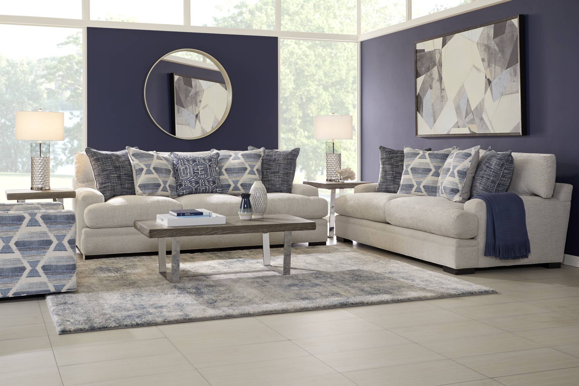 Hosting a versatile transitional design, the Bedford Park collection from Cindy Crawford Home delivers elevated style and astounding comfort. Upholstered with woven fabric in ivory, each piece has a soft, textured quality that will make family and friends feel right at home. Offering a hint of modern style, its low-profile track arms bring a chic aspect to the look. Seat cushions are filled with plush Feather Blend, providing exceptional comfort that goes a step above. In addition, seat and back cushions are reversible to help extend the life of your living room. An assortment of accent pillows features beautiful patterns in varying shades of blue. Block legs with a black finish add an elegant final touch. For added color, a matching accent swivel chair boasts an appealing geometric print in varying shades of blue. Upholstery: 100% Polyester. Cleaning Instructions: Use water based cleaning agents or foam.