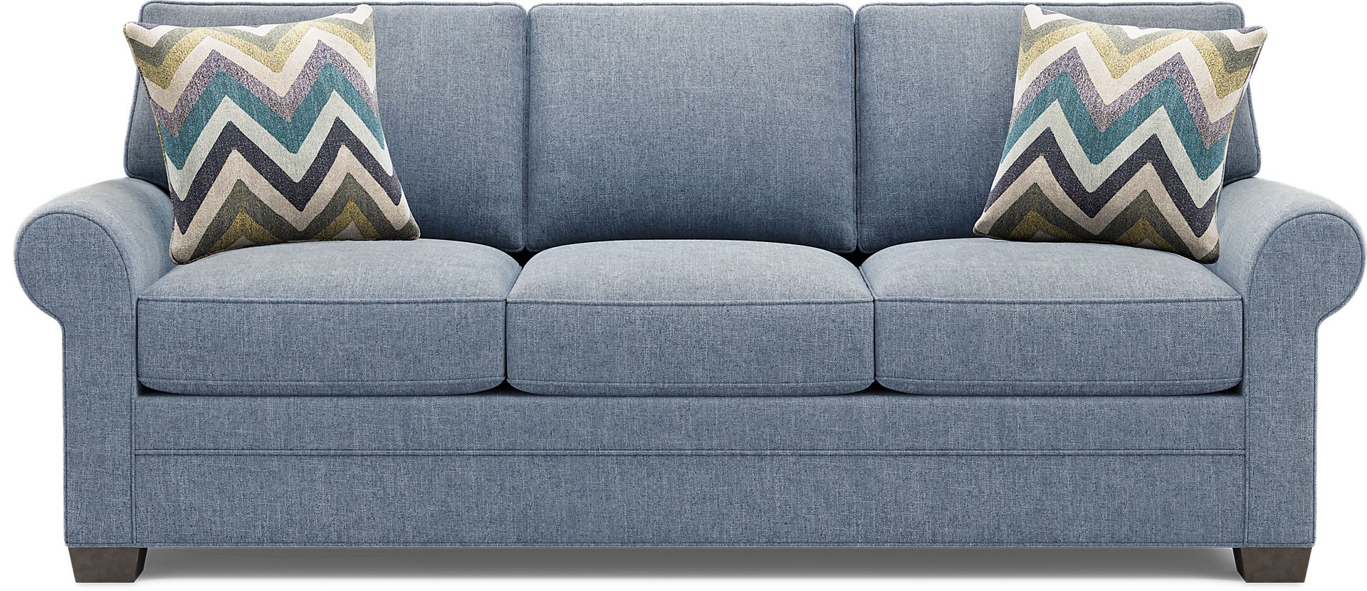 Timeless family-style seating is here with the Bellingham sofa from Cindy Crawford Home. Upholstered with textured chenille in an irresistible shade of chambray blue, this piece features reversible back and seat cushions with double-welted boxed borders. Matching accent pillows and padded rolled arms add perfect final touches. 100% Polyester
