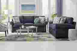 Your living room easily becomes a guest room with the versatile Bellingham sleeper loveseat. Upholstered in textured fabric, the loveseat boasts a midnight blue color. Effortless style is bestowed by reversible seat and back cushions with double welted boxed borders, matching toss pillows and padded rolled arms. The pull-out full size Gel Foam mattress features superior body contouring support that provides a cool, comfortable sleep environment. 100% Polypropylene