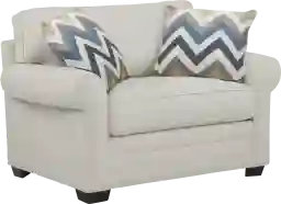 This sleeper chair is delivered ready for styling, as it includes two matching accent toss pillows. These pillows are designed to complement the textured off-white upholstery and provide additional lumbar support while sitting. The chair also features sturdy wood block legs, which provide a stable foundation and a touch of contemporary warmth to the classic design.