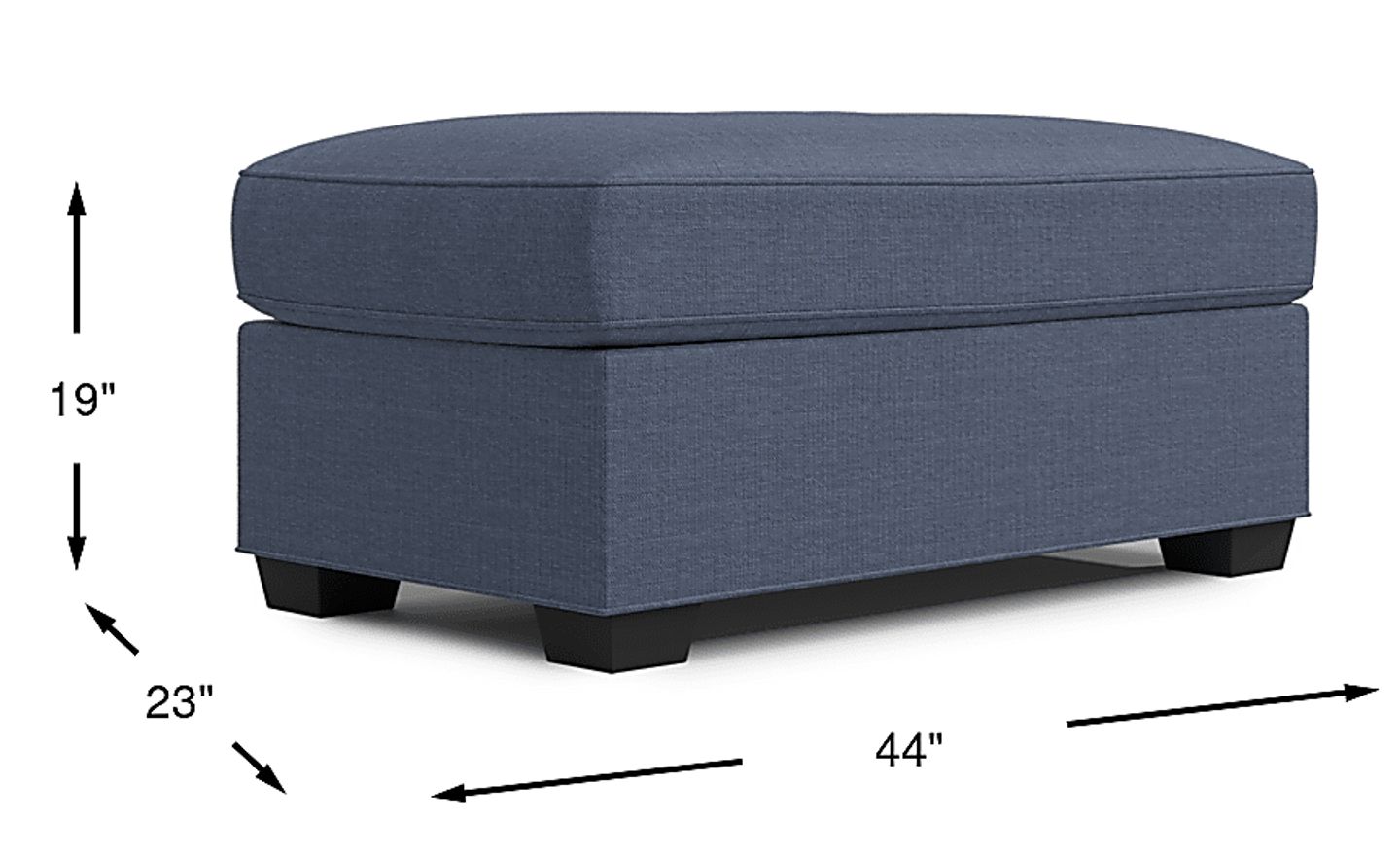 This rectangular ottoman stands at 19 inches tall, which aligns perfectly with the standard sofa seat height of 18 to 20 inches. For optimal comfort as a footrest, an ottoman should be equal to or slightly lower than your seating cushions to maintain proper ergonomic alignment. With its 44-inch width, this piece provides a substantial surface area that scales proportionally with full-sized sofas and sectionals.