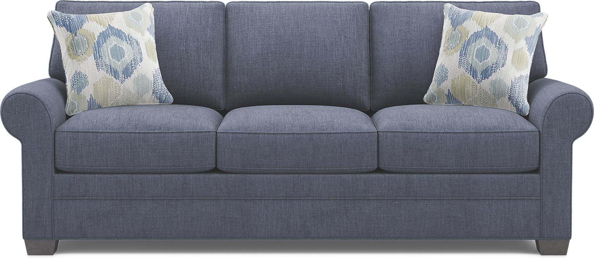 Timeless family-style seating is here with the Bellingham sofa from Cindy Crawford Home. Upholstered with textured chenille in an irresistible shade of sapphire blue, this piece features reversible back and seat cushions with double-welted boxed borders. Matching accent pillows and padded rolled arms add perfect final touches. Upholstery: 100% Polyester.
