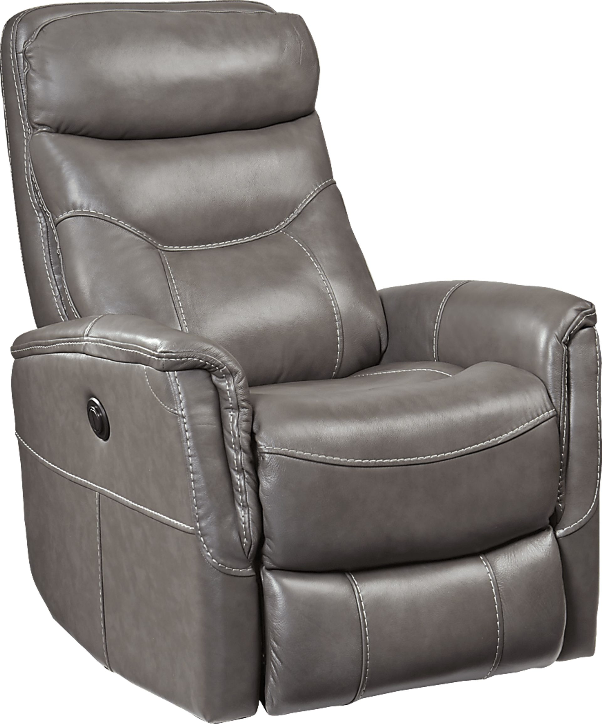The tailored contemporary look of the Bello glider recliner creates a timeless design that will make it your new favorite chair. From the supple gray leather upholstery wherever the body touches, to the coordinating stitching details, this chair is exceptional. Padding along the back creates lumbar support, and at the push of a button you'll experience all-encompassing comfort as the fully padded chaise-style footrest extends. So sit back and let this luxuriously sophisticated recliner enfold you in a totally relaxing experience. Top Grain Leather Where the Body Touches and Vinyl Sides and Backs.
