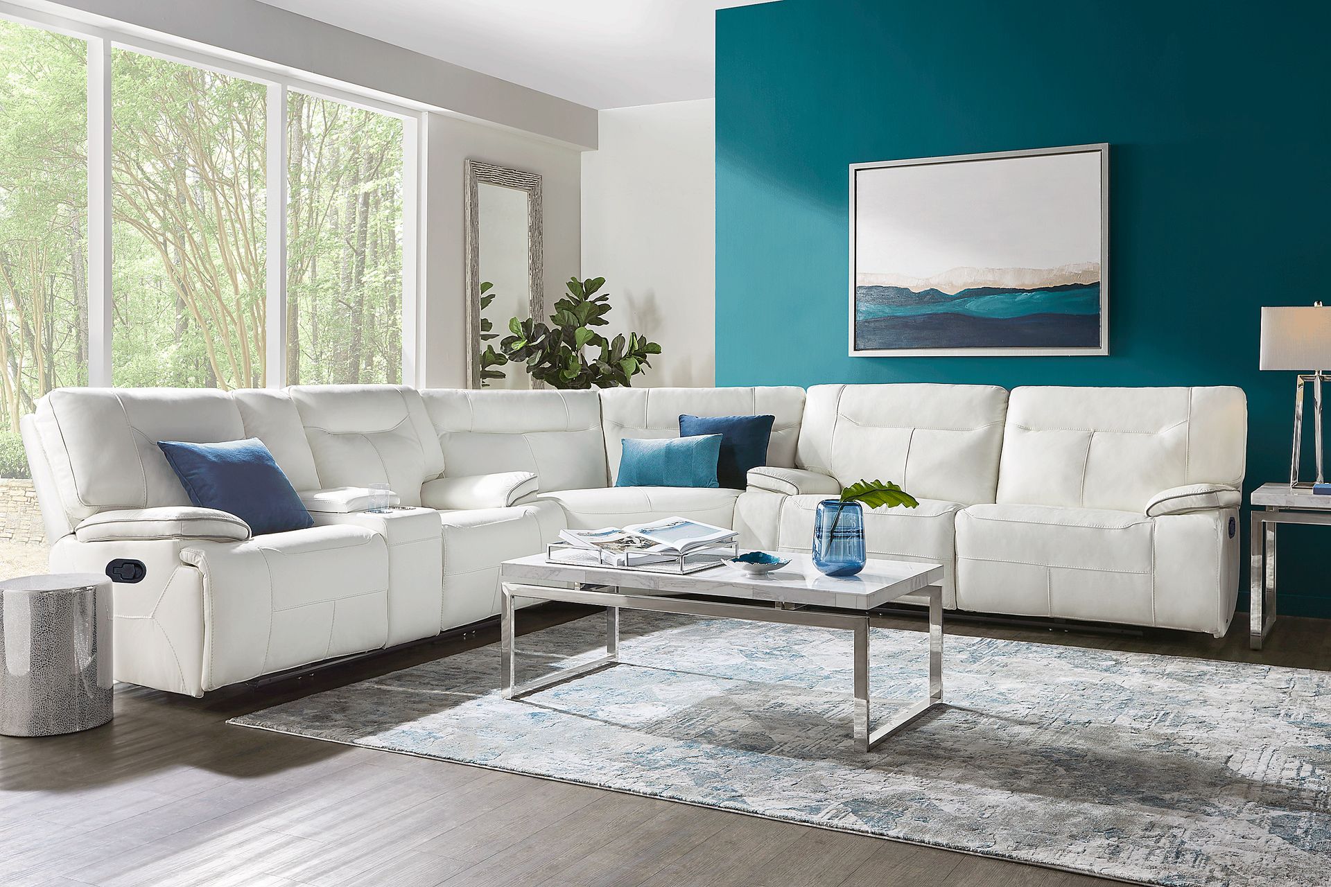 Perfect for those who like to entertain, the Bernsley sectional from Cindy Crawford Home is an excellent choice. Transitional in style, this stunning sectional is upholstered in premium top grain leather where the body touches in a beautiful white color. The easy-to-use manual reclining system allows you and your guests to effortlessly relax and unwind. Upholstery: Top grain leather where the body touches and polyurethane sides and back.