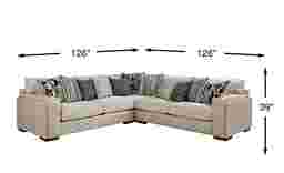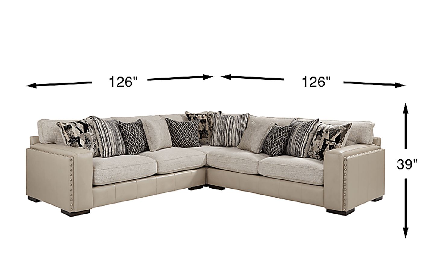 Complete your living room look with the luxurious comfort and unique transitional style of the Broad Street sectional from Cindy Crawford Home. The base features ivory-colored, top grain leather upholstery where the body touches with nailhead accents for classic flair, while the reversible seat and back cushions are adorned with beige woven upholstery. The FeatherPlush seat cushions deliver decadently soft comfort thanks to memory foam toppers and feather and down filling. Ideal for movie nights or get-togethers, the sectional seats up to five people. An array of soft accent pillows, included, offers cushioned comfort in a variety of contemporary patterns and shades of black, gray and ivory. Upholstery: Top grain leather base; 100% Polyester cushions.