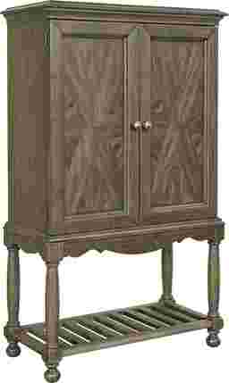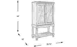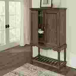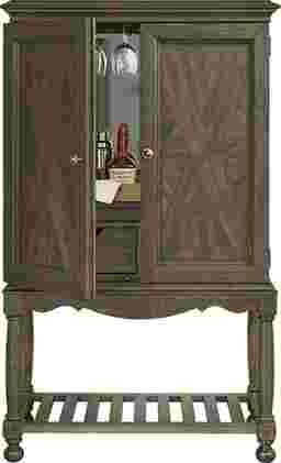 A beautiful and useful addition to any dining space, the Calle Vista bar cabinet transforms any corner into an elegant entertaining space. Crafted of acacia solids with hickory veneers in a rich brown finish, this chic piece features a unique veneer pattern on the two cabinet doors. The doors open to reveal a mirror backed bar space, complete with hanging wine glass storage, integrated lighting and two drawers. A lower shelf offers additional storage space, while pewter finished hardware completes the stunning look.