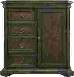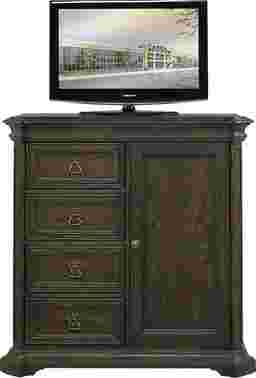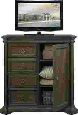 Part media storage spot, part bureau, the Calle Vista media chest is a versatile choice for your bedroom. Crafted of acacia solids with hickory veneers, a rich brown finish is complemented by antiqued pewter hardware. Four drawers on one side are ideal for storing games, or other media components, while the door on the other side opens to reveal three open cubbies perfect for additional storage.