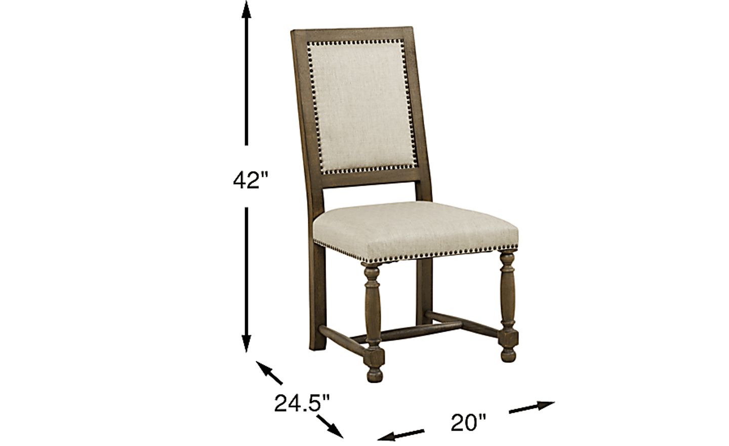 Comfortable and stylish, the Calle Vista side chair offers a plush place to perch for even the longest dinner parties. Featuring a sturdy frame crafted from acacia solids with hickory veneers in a rich brown finish, this elegant chair features neutral beige upholstery accented with nailhead trim for a timeless stylish look.