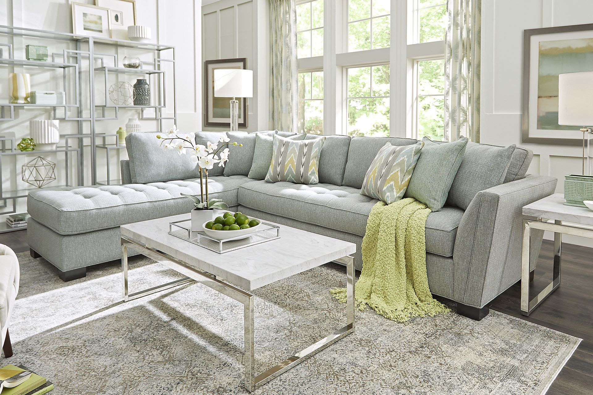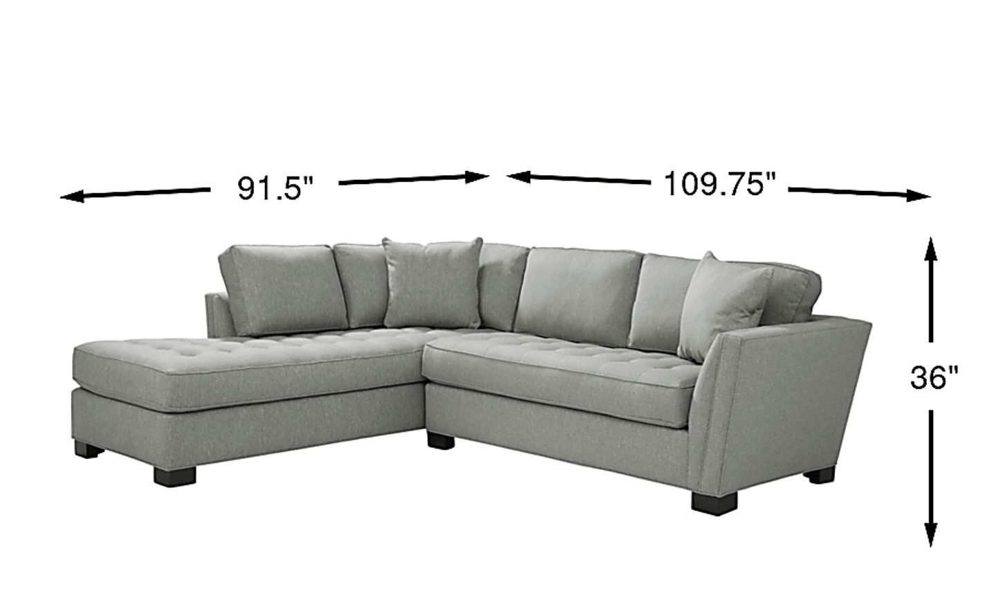 Stylish and highly versatile, the Calvin Heights sectional offers a classy, contemporary feel that is both elegant and inviting. Upholstered in textured fabric for deep, comfortable seating, its bluestone color lends fantastic eye appeal. Perfect for living rooms, this sectional creates a designated gathering spot for family and friends. Premium design features include welting details, sleek track arms and bench-style seat cushions with chic tufting for a well-tailored silhouette. Quality constructed on a hardwood frame for strength and stability, its sinuous wire seating system provides long-lasting support. Matching solid colored pillows included. 100% Polypropylene. Accent pillows sold separately.