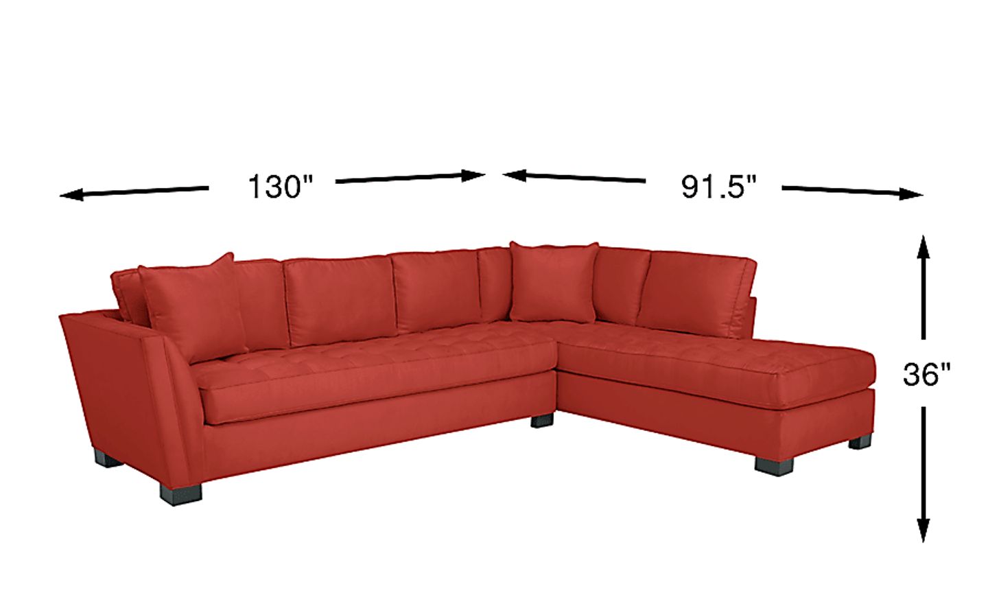 Stylish and highly versatile, the Calvin Heights sectional offers a classy, contemporary feel that is both elegant and inviting. Upholstered in durable Microfiber for deep, comfortable seating, its bold brick color lends fantastic eye appeal. Perfect for large spaces, this expansive sectional easily turns your living room into a gathering spot for family and friends. Premium design features include welting details, sleek track arms and bench-style seat cushions with chic tufting for a well-tailored silhouette. Quality constructed on a hardwood frame for strength and stability, its sinuous wire seating system provides long-lasting support. Matching solid colored pillows included. 100% Polyester. Accent pillows sold separately.