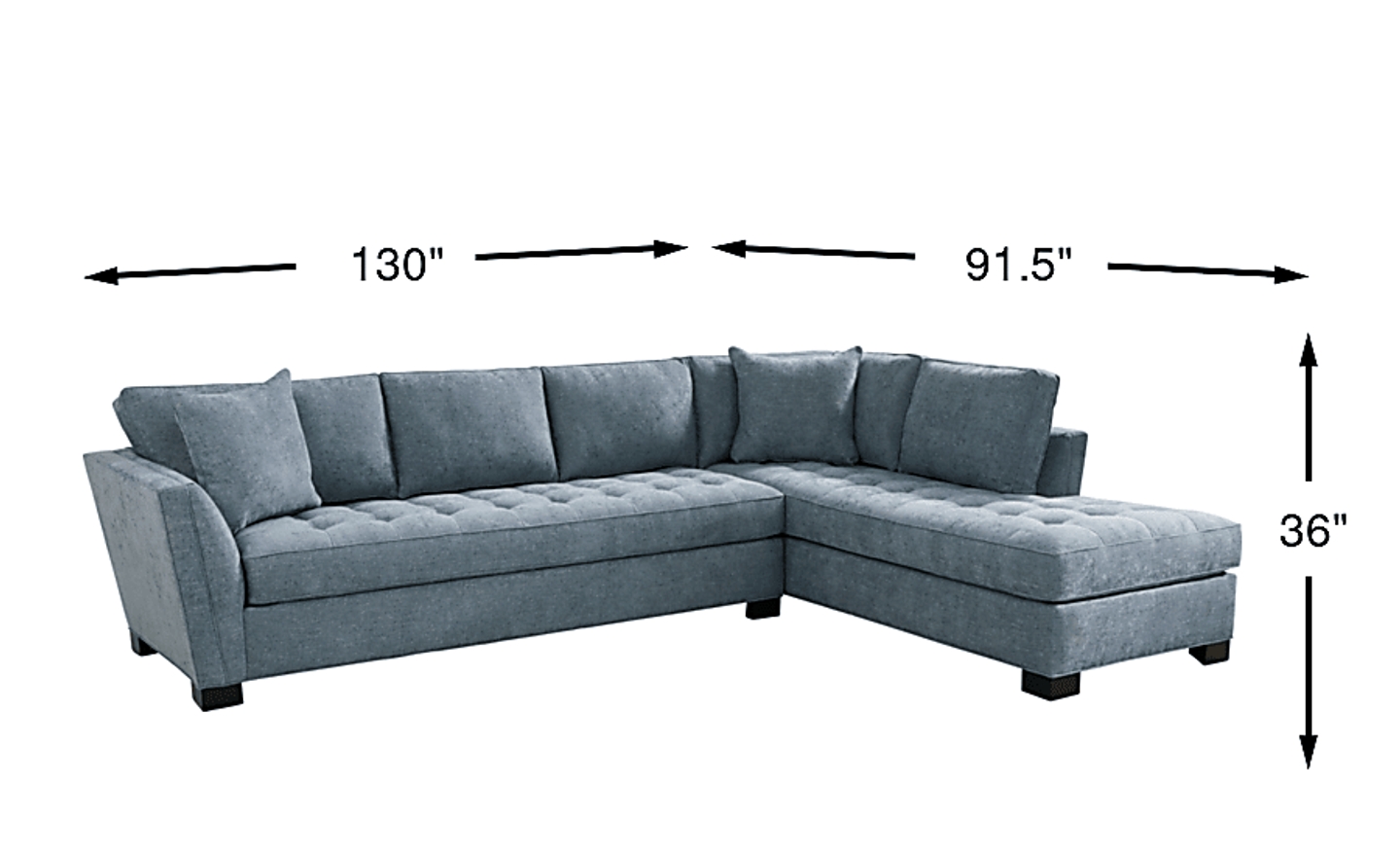 Stylish and highly versatile, the Calvin Heights XL sectional offers a classy, contemporary feel that is both elegant and inviting. Covered in thickly textured woven fabric that offers comfortable, deep seating for you and your guests, the chic chambray blue color lends fantastic eye appeal. Perfect for living rooms, this sectional creates a designated gathering spot for family and friends. Premium design features include welting details, sleek track arms and bench-style seat cushions with chic tufting for a well-tailored silhouette. Quality constructed on a hardwood frame for strength and stability, its sinuous wire seating system provides long-lasting support. Matching solid-colored pillows included. Upholstery: 100% Polyester. Accent pillows sold separately.