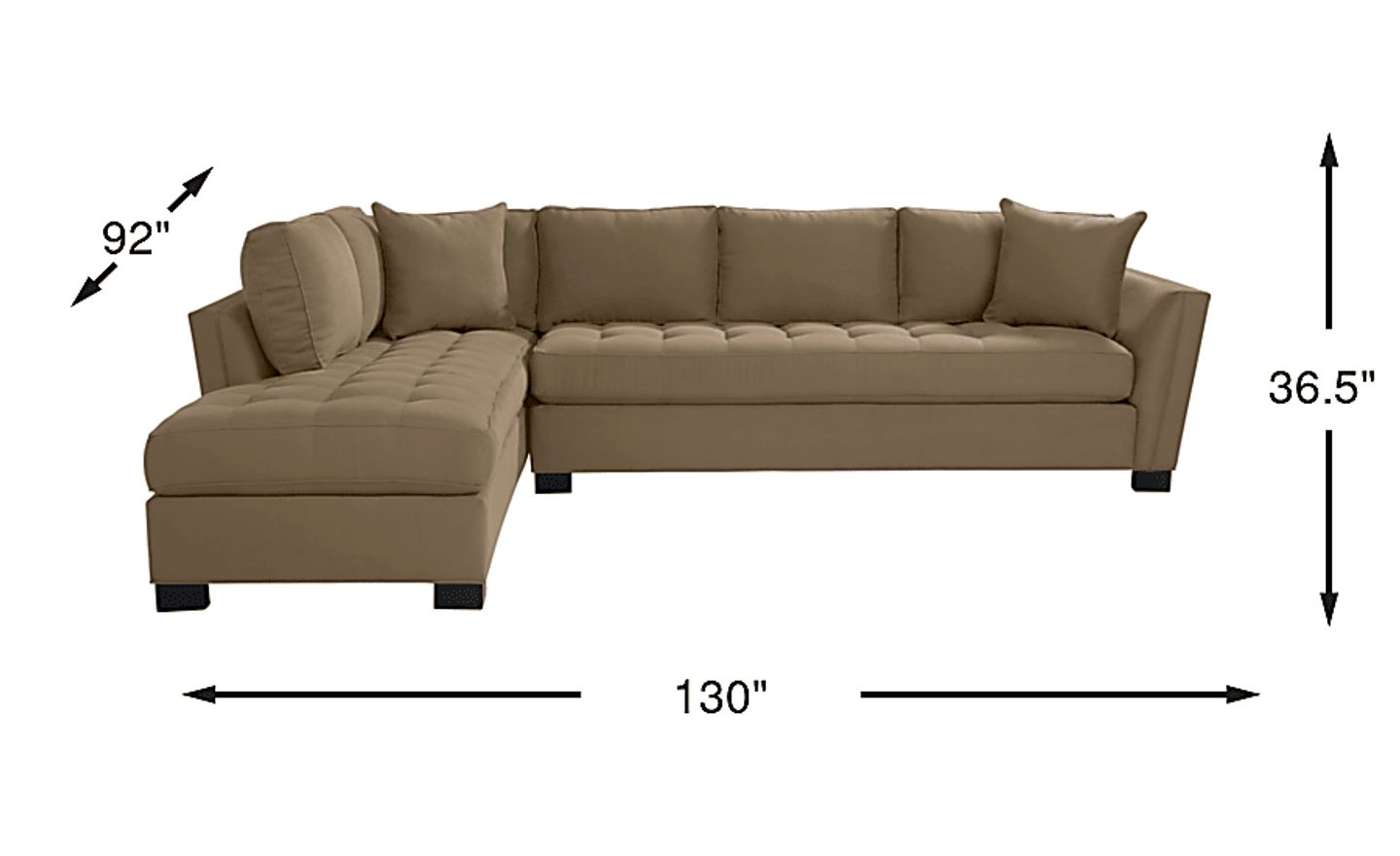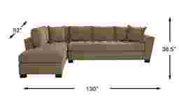 Stylish and highly versatile, the Calvin Heights sectional offers a classy, contemporary feel that is both elegant and inviting. Upholstered in durable Microfiber for deep, comfortable seating, its khaki color lends fantastic eye appeal. Perfect for large spaces, this expansive sectional easily turns your living room into a gathering spot for family and friends. Premium design features include welting details, sleek track arms and bench-style seat cushions with chic tufting for a well-tailored silhouette. Quality constructed on a hardwood frame for strength and stability, its sinuous wire seating system provides long-lasting support. Matching solid colored pillows included. 100% Polyester. Accent pillows sold separately.