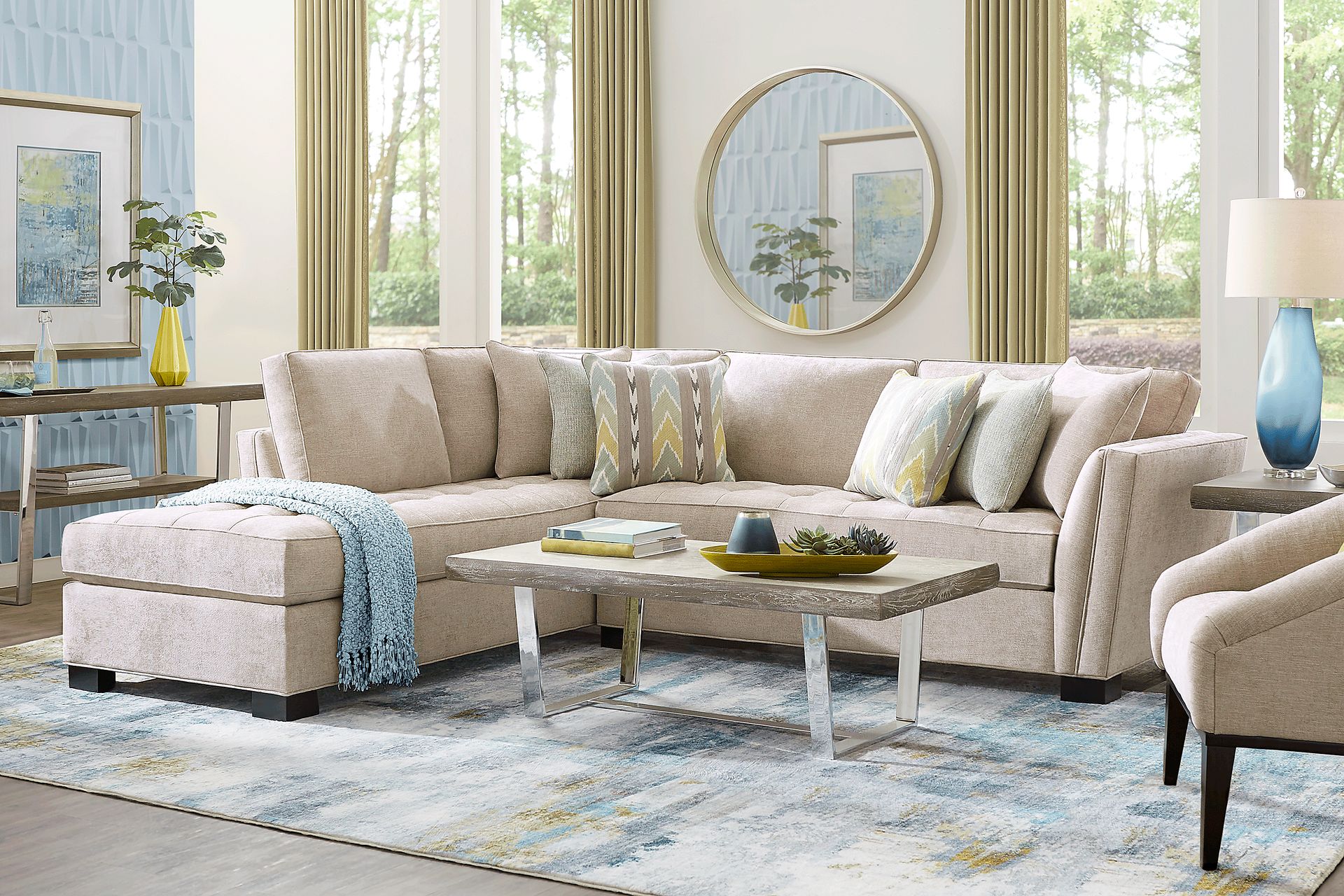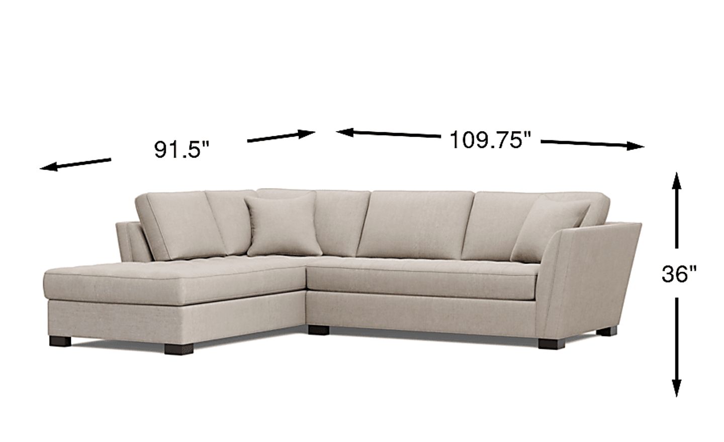 Stylish and highly versatile, the Calvin Heights sectional offers a classy, contemporary feel that is both elegant and inviting. Covered in thickly textured woven fabric that offers comfortable, deep seating for you and your guests, the neutral mushroom color lends fantastic eye appeal. Perfect for living rooms, this sectional creates a designated gathering spot for family and friends. Premium design features include welting details, sleek track arms and bench-style seat cushions with chic tufting for a well-tailored silhouette. Quality constructed on a hardwood frame for strength and stability, its sinuous wire seating system provides long-lasting support. Matching solid-colored pillows included. 100% Polypropylene. Accent pillows sold separately.