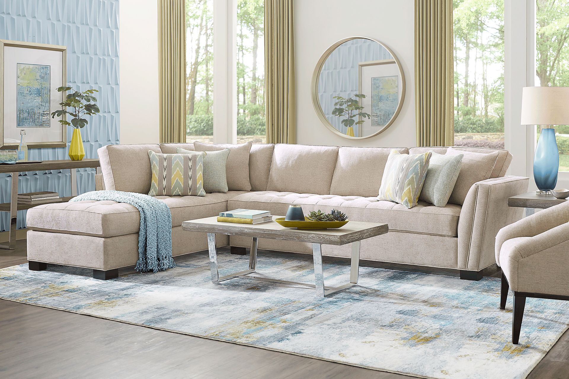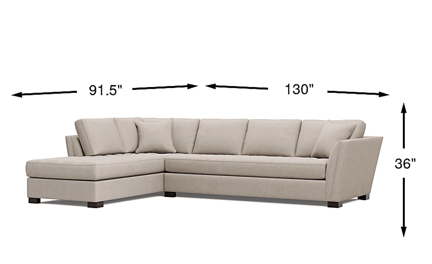 A versatile, stylish and exceptional piece of furniture, the Calvin Heights XL sectional brings a classic contemporary feel that has just the right amount of upscale elegance. Covered in thickly textured woven fabric that offers comfortable, deep seating for you and your guests, the neutral mushroom color lends fantastic eye appeal. Quality constructed on a hardwood frame for strength and stability, the sinuous wire seating system provides additional support for an enduring and solid foundation. Premium design features such as welting details, track arms, and elegant tufting on the bench-style seat cushions maintain a tailored silhouette and afford a long life and beautiful appearance. Matching solid-colored pillows included. 100% Polyproylene. Accent pillows sold separately.