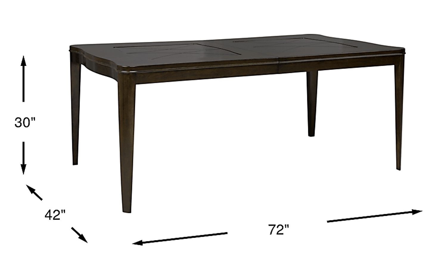 72"l x 42"w x 30"h, extends to 90" with leaf