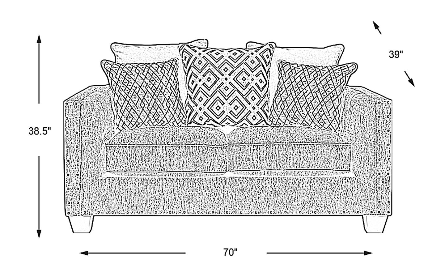 An inviting spot for two, the Chelsea Hills loveseat adds an elegant charm to any living space. Upholstered in gray woven fabric, sleek track arms are enhanced by interior button tufting. Brushed nickel nailhead accents add an additional element of sophistication, while a stylish mix of solid charcoal, light gray and geometric patterned back pillows makes a chic, comfortable statement. 72% Polyester, 28% Acrylic