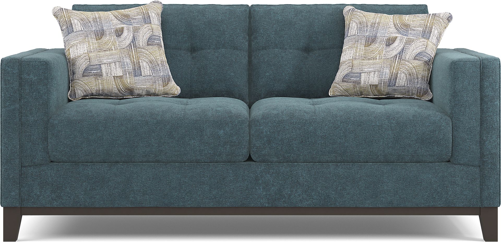 With comfortable seating for up to two, the Everleigh Place loveseat for Cindy Crawford Home is an excellent choice for both small and large gathering spaces. Upholstered in a plush chenille fabric, this piece comes in a lagoon blue color that is pleasing to the eye. Featuring padded track arms and an espresso-finished wood base, this loveseat is great for those looking to get creative with their space. 100% Polyester.