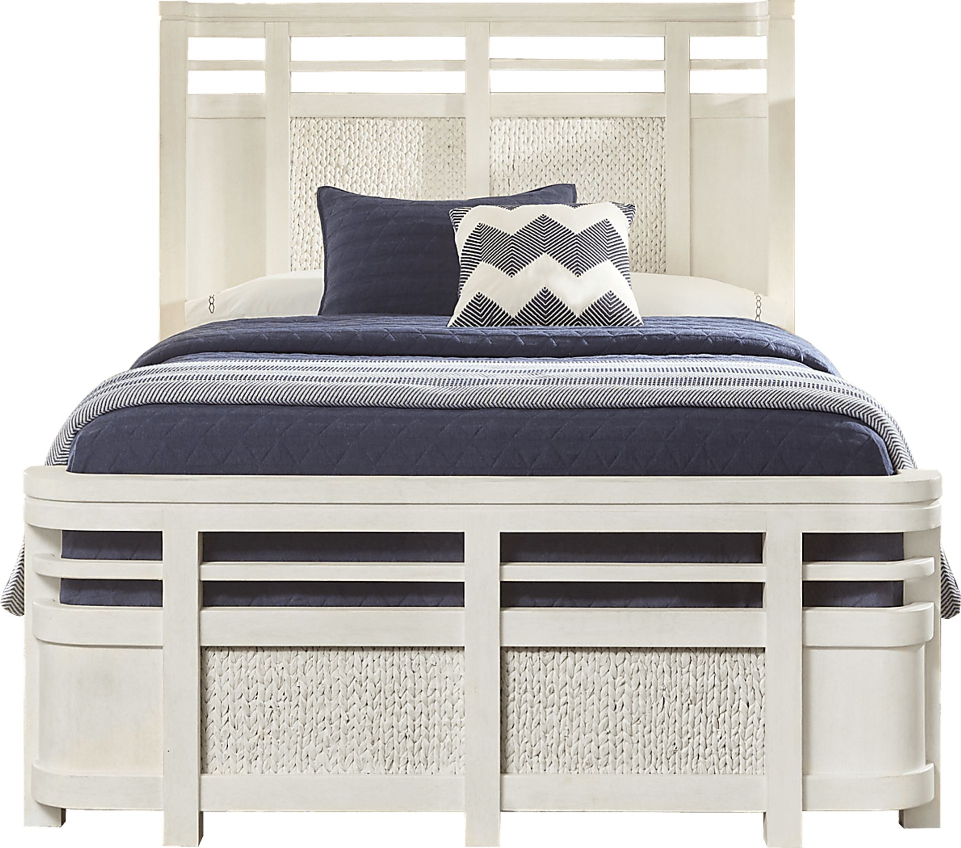 Create a tropical retreat worthy of any island resort with the Golden Isles bed. This piece is grand yet relaxed thanks to the graceful shape of the curved headboard and footboard balanced by the woven accents and vibrant white finish. Quality crafting is achieved with poplar solids and Mindy veneers. Mattress and foundation (if required) sold separately.