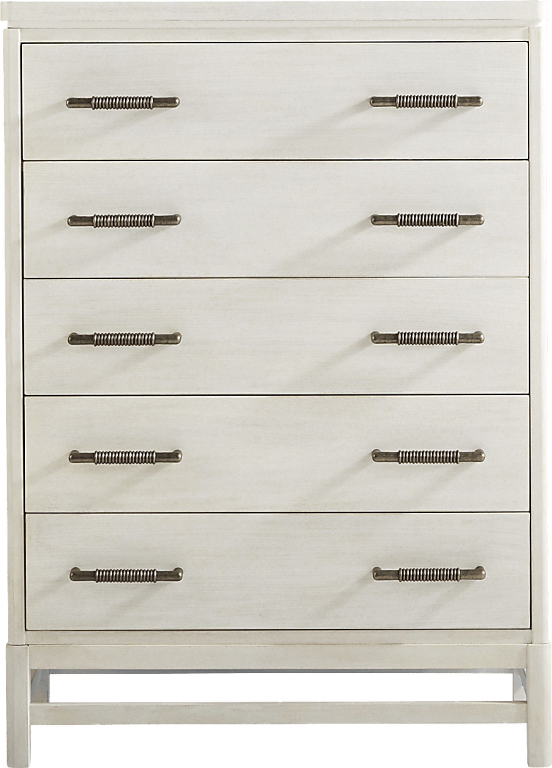 Keep your vacation wardrobe and other accessories neatly tucked inside the Golden Isles chest. This storage savvy piece flaunts five drawers to help you maximize the space in your room. For stability and strength each drawer is made with English dovetail joints. Overall durability is ensured by sturdy poplar solids and Mindy veneers in a white finish. Pewter finished handles add appealing embellishments.