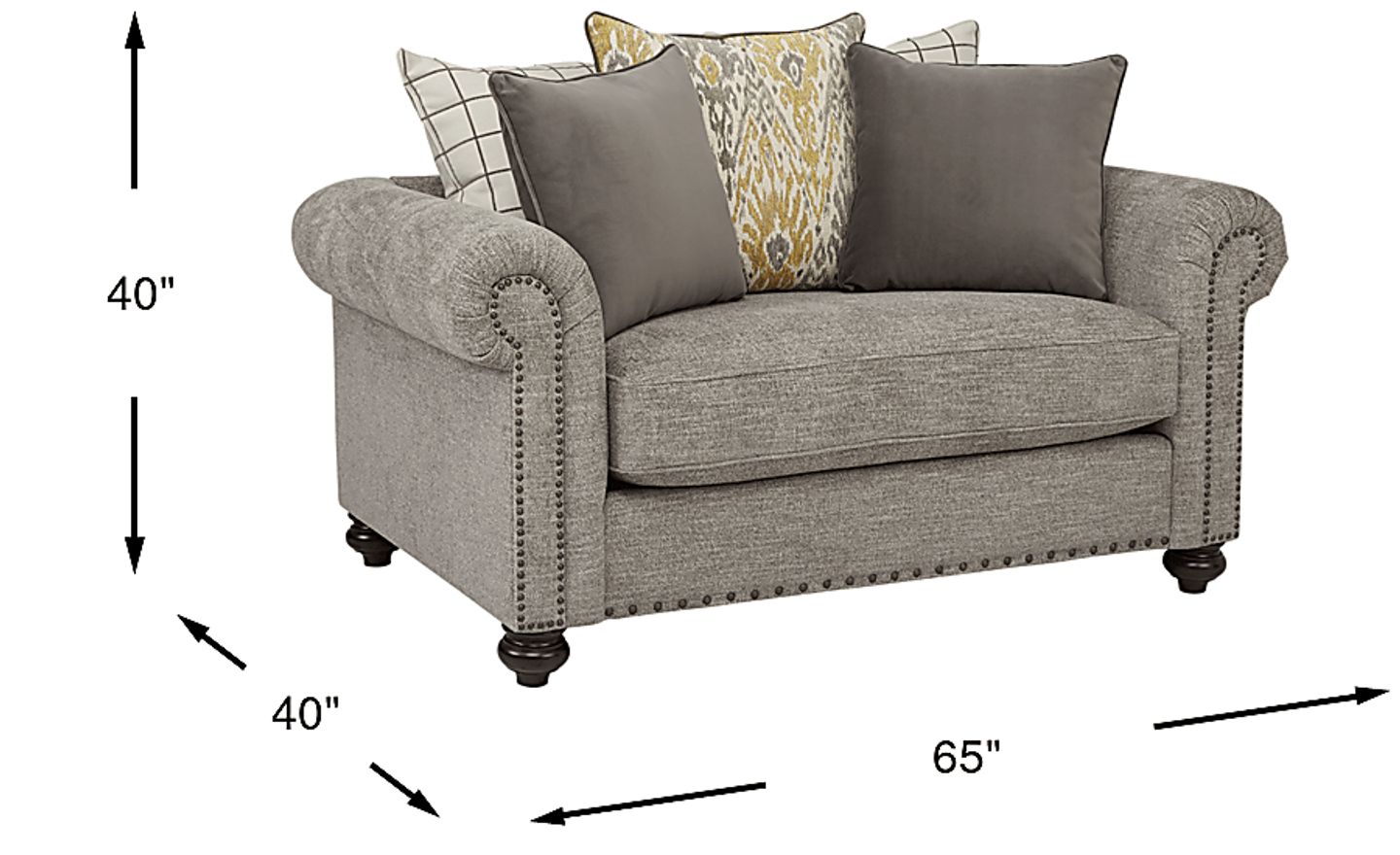 With loose scatter pillow back and luxurious gray plush woven chenille upholstery, the Greenwich Pointe chair from the Cindy Crawford Home collection is your new favorite place to relax. Burnished nailhead accents, loose scatter pillow back and luxurious padded roll arms offer elegant appeal, while a reversible seat cushion and sinuous wire seating ensure this piece lasts for years to come. The piece sits atop an elegant set of medium brown finished turn legs for a handsome blend of traditional and transitional styles. Upholstery: 86% Polyester, 14% Polypropylene