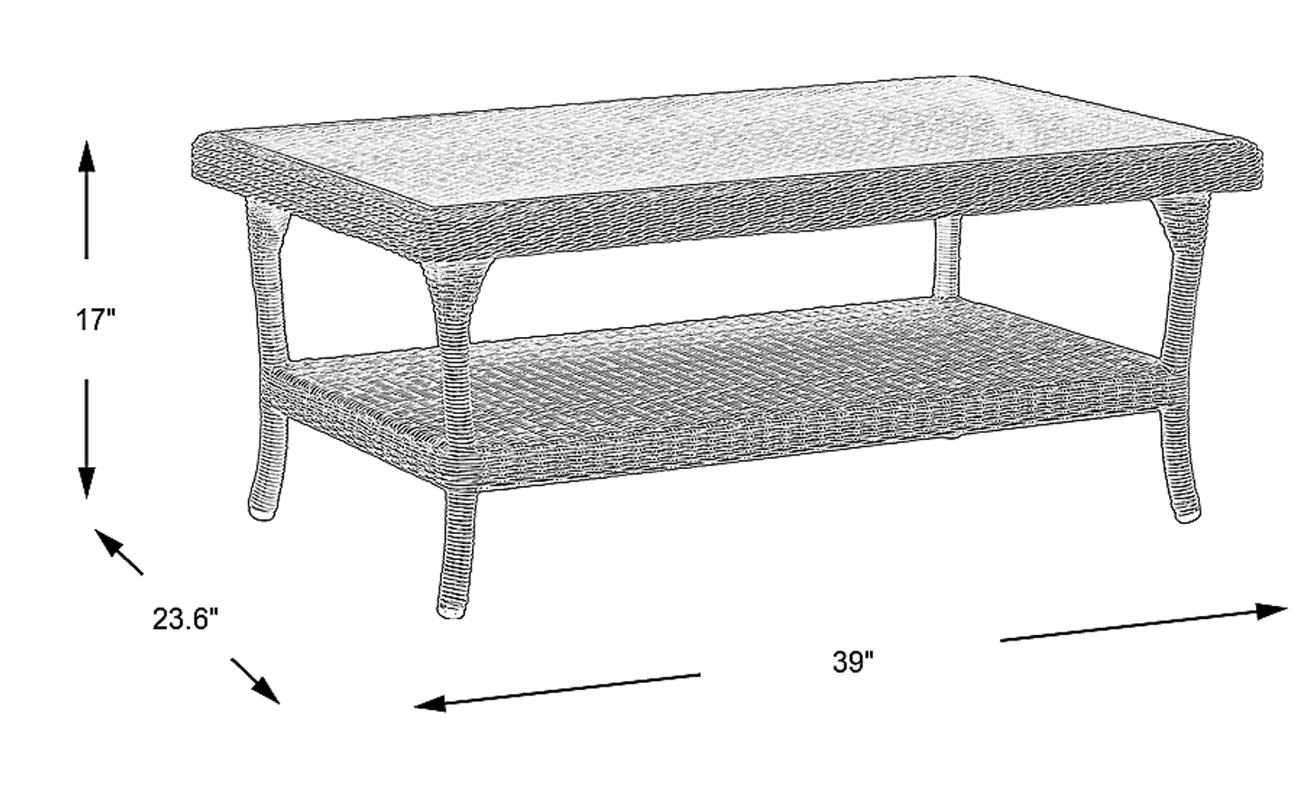 Outdoor living is easier when you have just the right piece to complete your patio set. The Hamptons Cove cocktail table is just that. Expertly crafted of textured handwoven dove gray wicker, clear glass on the 24 x 39 inch top combines with curved lines and a lower display shelf for a casual, contemporary aesthetic.