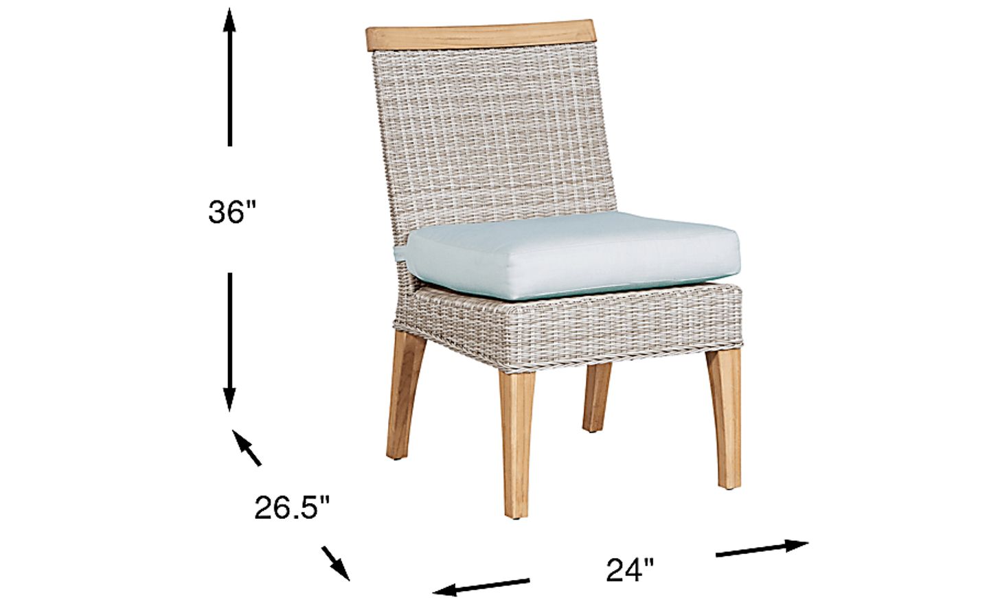 The Hamptons Cove side chair combines casual beachside living and sleek contemporary style. Textured handwoven dove gray wicker is accented with smooth-sanded plantation teak accents to create a charming aesthetic. The removable Sunbrella fabric seat cushion is filled with a foam-core wrapped in mist blue-gray colored solution-dyed acrylic for long lasting durability. 100% Sunbrella fabric. To clean Sunbrella fabric cushions remove dirt and spray on cleaning solution (water and mild soap), then use a soft bristle brush or sponge. Allow cleaning solution to soak into fabric and rinse thoroughly until soap residue is removed. Air dry. Do not dry clean.
