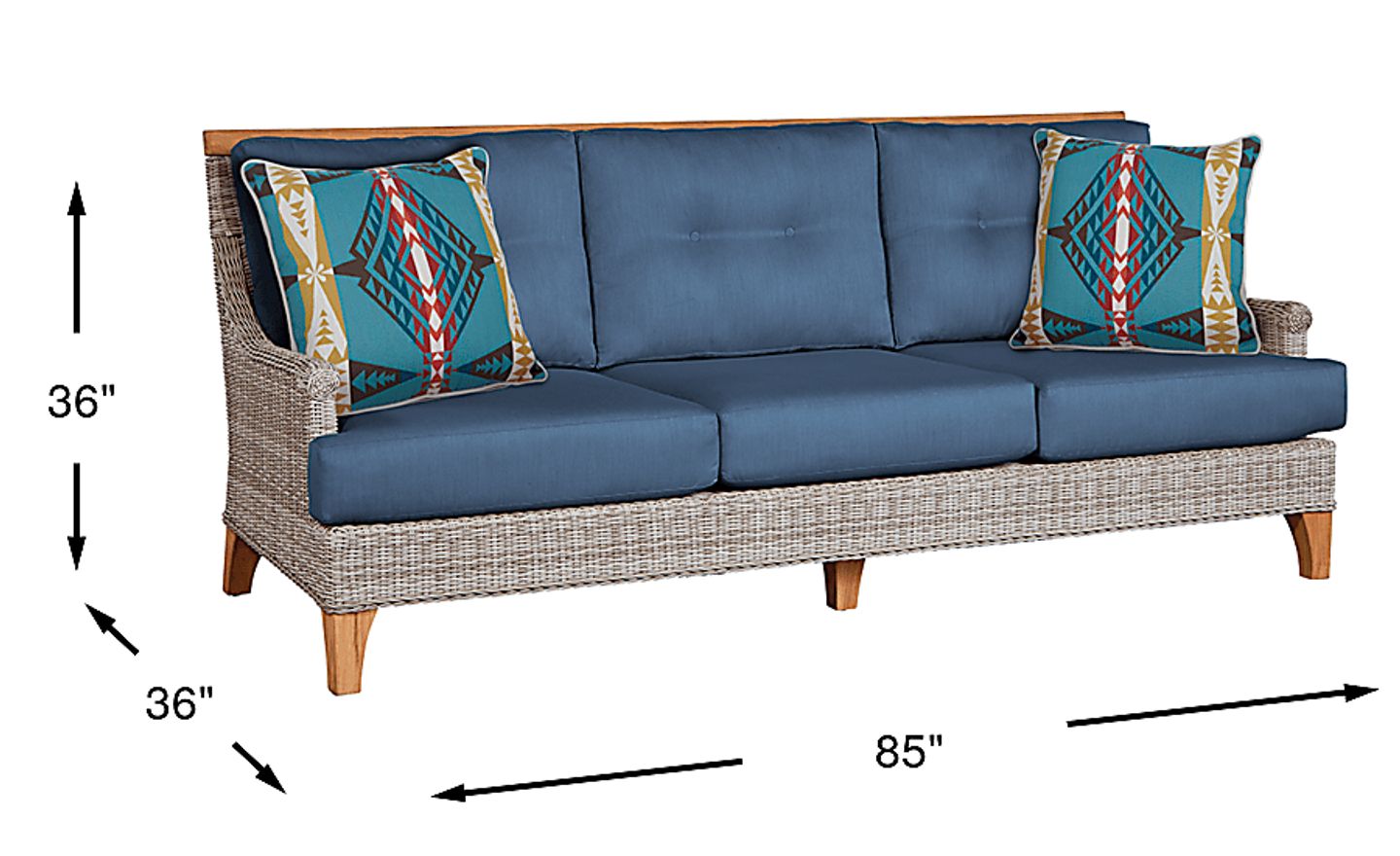 The Hamptons Cove sofa beautifully combines casual beachside living and sleek contemporary style. Textured handwoven dove gray wicker is accented with smooth-sanded, sustainably harvested plantation teak accents to create a charming aesthetic. Each Sunbrella fabric cushion is filled with foam-cores wrapped in solution-dyed acrylic in a denim blue color. Decorative toss pillows and subtle button tufting details on the back cushions add an appealing, tailored touch. 100% Sunbrella fabric.