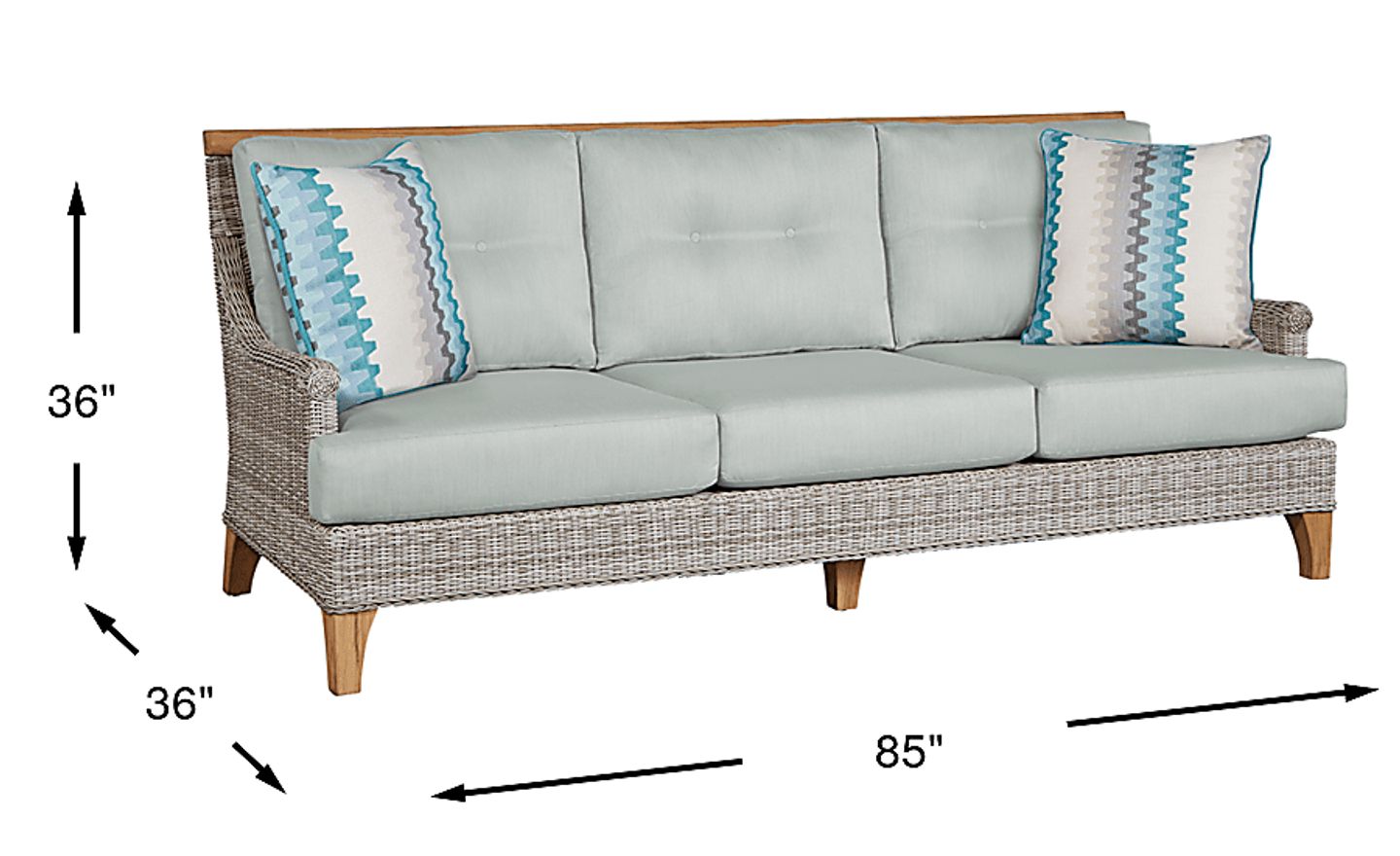 The Hamptons Cove sofa beautifully combines casual beachside living and sleek contemporary style. Textured handwoven dove gray wicker is accented with smooth-sanded plantation teak accents to create a charming aesthetic. Each Sunbrella fabric cushion is filled with foam cores wrapped in solution-dyed acrylic in a misty green color. Decorative toss pillows and subtle button tufting details on the back cushions add an appealing, tailored touch. 100% Sunbrella fabric.