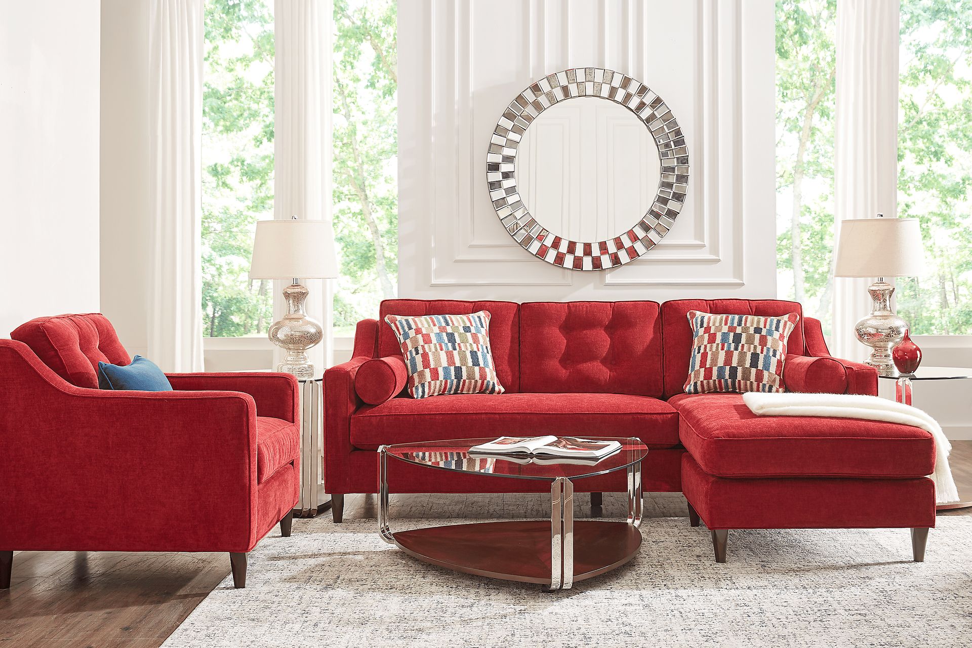 Combining classic and contemporary styles, the Hanover chaise sofa from Cindy Crawford Home delivers class and comfort. Upholstered in soft chenille fabric, this piece features a vibrant ruby color to refresh your space. Sleek track arms, welting details and tufting on the back cushions give it a designer look. The reversible chaise can be floated to either end of the sofa's frame by simply flipping its seat cushion. Offering form and function, its tapered legs claim a dark espresso finish. Matching bolster pillows, included, enhance the modern look. Plus, a pair of accent pillows features a colorful striped pattern. Upholstery: 100% Polyester.